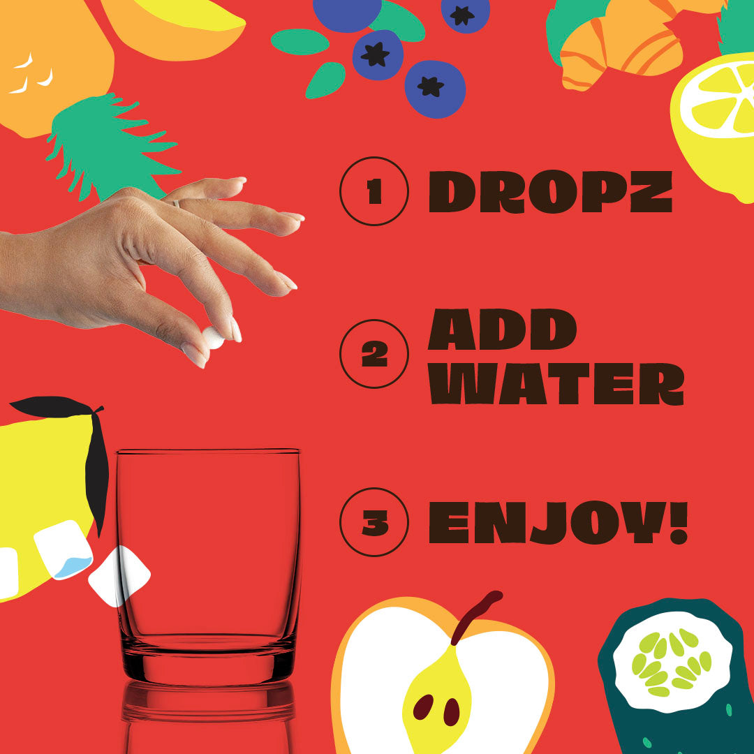 Ein Dropz reicht für 250–500 ml Wasser — je nachdem, wie intensiv du den Geschmack haben möchtest.