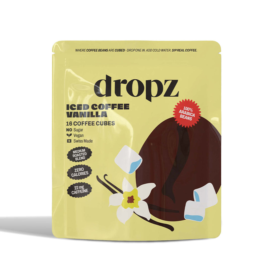 Iced Coffee Cubes sind WĂŒrfel aus echtem gebrĂŒhten Kaffee, Schock gefroren, um Aroma und Koffein zu bewahren. Einen dropz Cube ins Glas geben, kaltes Wasser darauf giessen, trinken, geniessen. Wie du es magst: pur, mit Hafermilch oder auf Eis.